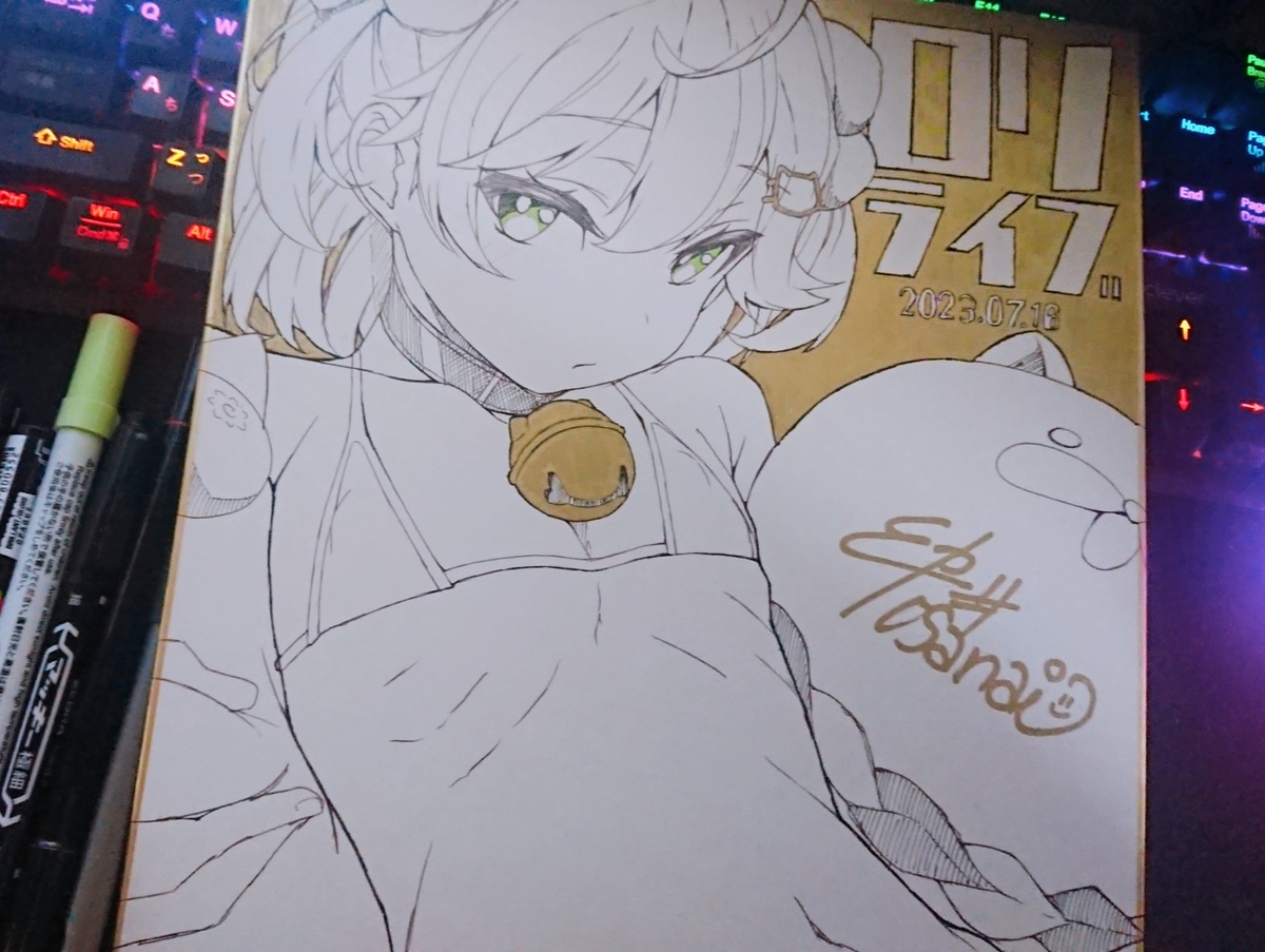 新刊の表紙と同じデザインの色紙です。1枚しか描く元気なかったので1枚限定となります。背景を金マーカーで塗っているので豪華な感じがします。