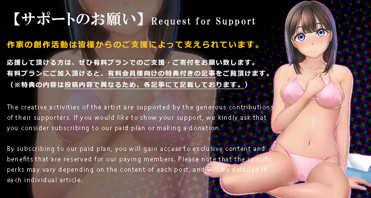 絵師・同人作家のKAGEMUSYAです。 私の創作活動をご支援して頂ける方を大募集です! 【作品サンプル】sample ▼オリジナルファンタジーモノ https://bit.ly/3wLO9MZ ▼五つ子ちゃんシリーズ https://bit.ly/3qIIvHw ▼か◯や様 https://bit.ly/3IP9tnl 【主な作品形式】 ・イラスト ・差分付きイラスト(セリフ・表情・動作などがあるもの)やCG集形式 ・漫画 【ご支援の各種プランと有料プランの特典について】 有料プランにてご支援頂きますと、 有料プラン会員様向けのコンテンツや、情報などをご覧頂けます。 ご支援プランは以下となります。 フォローのみでも大歓迎ですので、お気軽にどうぞ! 無料プラン :一般公開作品・無料記事をご覧頂けます。 500円プラン :特典つき作品・有料記事をご覧頂けます。 1000円プラン:500円プランと同じ内容ですが、推して頂ける方用のプランです! ※将来的に活動の事情によって、変更する場合があります。 ★★【入会前に必ずヘルプページをご覧ください!】★★ その他、有料プランご加入の際は、必ずサイトのヘルプページで、有料プランについての各種説明欄のご確認をお願い致します。 ⇨ヘルプページ: https://bit.ly/3Qs5jFW ※サイトシステム上のご質問等は当方では対応しておりませんので、サイト運営様にご確認下さい。 ●ご支援して下さる皆さまへ 【頂いた支援金について】 皆様から頂戴した支援金は、執筆に使うソフト・ハードウェア費を始め、 作品制作費・創作活動費・生活費等に大切に使わせて頂きます! 【記事更新について】 商業や同人の執筆作業が発生しておりますと、そちらを優先しますので、 基本的には不定期更新とさせて頂いています。 なにぶん個人活動のため何卒ご了承下さいませ。 皆様のご支援・応援のおかげで、私は創作を続ける事が出来ます。 感謝いたします!m(_ _)m ●※ご注意※ その他のクリエイター支援営サイトも登録しております。 ▼Fantia https://fantia.jp/fanclubs/8186 ▼Ci-en https://ci-en.dlsite.com/creator/12739 公開しております有料記事・コンテンツは、上記各サイトで公開している内容と重複しております。 もし各社のサービスで、既にご支援頂いてる方がいらっしゃいましたら、重複のご支援にご注意下さい。 ----------------------------------------------------------------------- 有料プラン会員様向けの記事・コンテンツにつきましては、 Pixiv FANBOX以外のクリエイター支援サービスで公開している、 有料コンテンツと内容が重複するときがあります。 もし複数のサービスで、ご支援頂いてる方が いらっしゃいましたら、ご注意下さい。