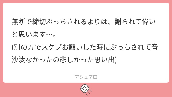あと無断で期限超過はしないというよりは、単純に謝らせてほしかったので謝りました…今後もおそらくそうだと思うのですが、それ以前に締め切りは守ろう!(己)