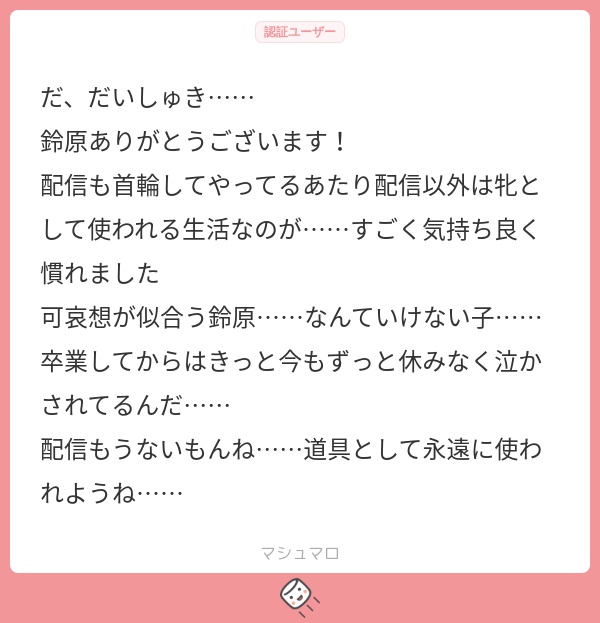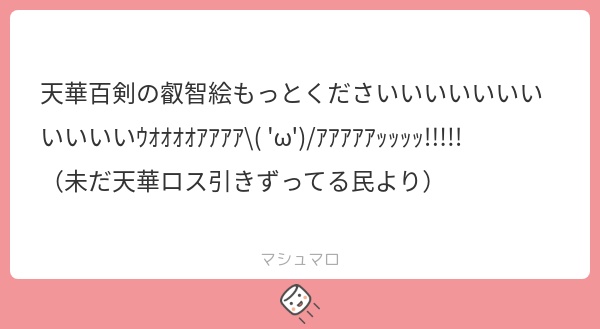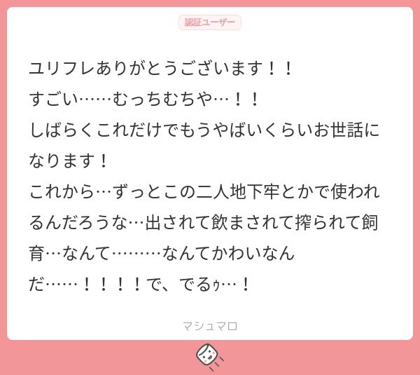 その他、いくつか真摯で実直なろずへのねぎらいのマシュマロも貰ったのですが、ココで返信するのはちょっと恥ずかしいのでろずだけの秘密にします。