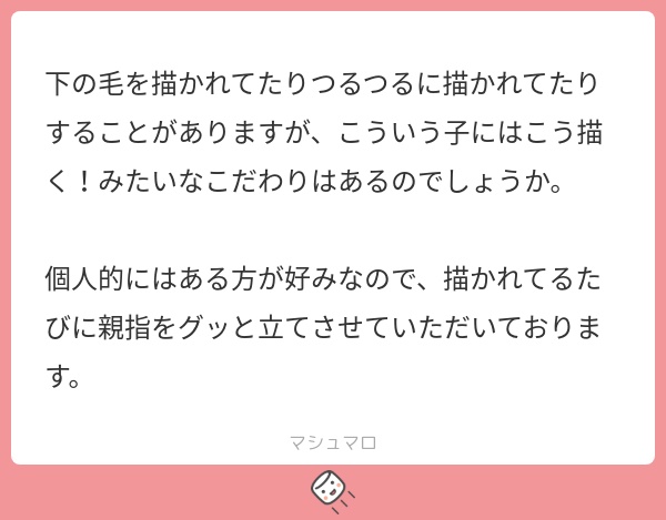 ろず個人としてはある方が好きです!ただ、Skebで「無しでお願いします!」というご依頼を貰ったりもするのでその際はその指示に従ってました。ただ、無毛のご指示はあっても「陰毛ありでお願いします!」というご依頼があんまりなかったので「描かない方がいいのかな?」と思ってたのですが、そう言っていただけるのであれば今後は積極的に描いていきたいと思います!ヤッター