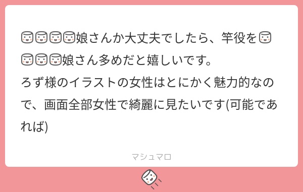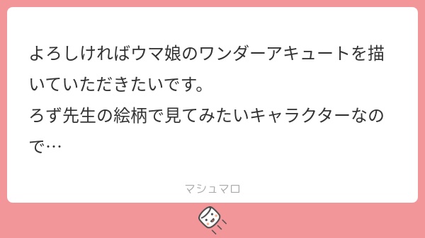 これは鈴xるxちゃんのイラストを描いたときに頂いたものですね!お題箱を始めた当初から何件かいただいていたので描かないわけにはいかないな…!と