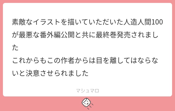 お疲れ様でした…陳腐な表現ですが、人造人間100号という作品は依頼者さんの中で生き続けていると思います。この件についてはこのイラストのfanboxでぐだぐだ語っているのでそっちを見てもらえると嬉しいです!
