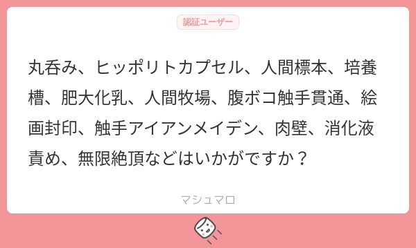 ろずの好みを強いて言えば、気持ちいい・可愛いのは好きかもです(丸呑み、消化液、肉壁…)。動けなくって恥辱を受ける系(培養槽、ヒッポリトカプセル、石化、絵画)も尊厳が破壊されていいですね。前のコマでめっちゃ抵抗しているイラストとかがあるとさらにいいですね…!肥大化、牧場…みたいなのも尊厳破壊に近いですが、前者と比べて有機的なのでどちらかと言えばこっちの方が好きかもです。