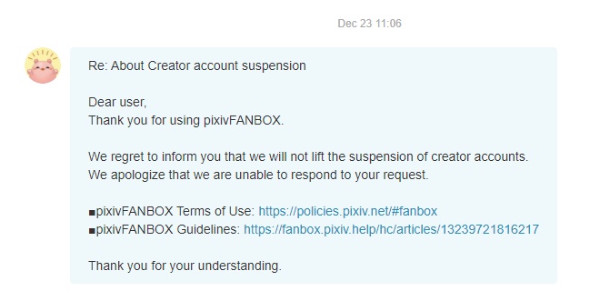 Yesterday I revisited every image and text on this account, blurred and censored everything, edited tags and headlines, then contacted fanbox support to review my page and cancel suspension if my page now follows their guidelines. Their answer: