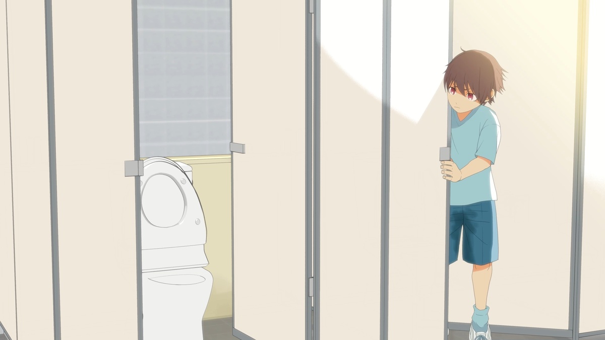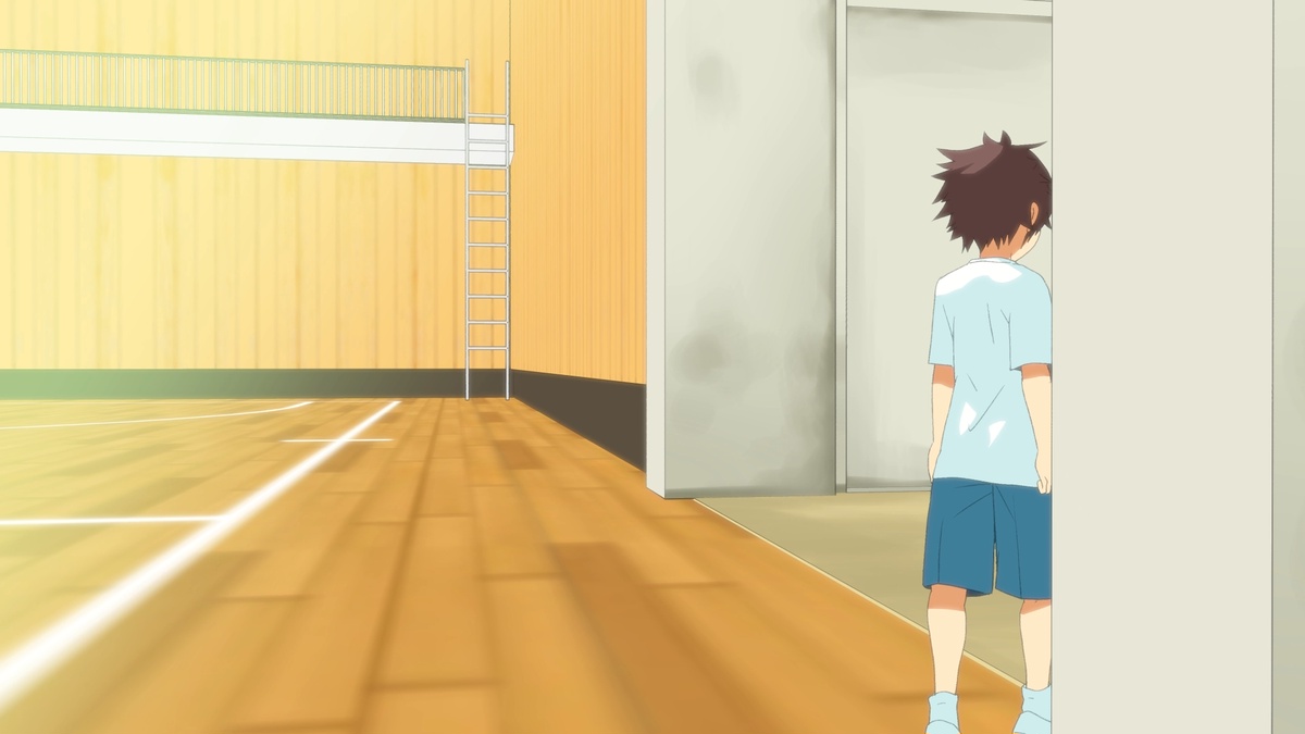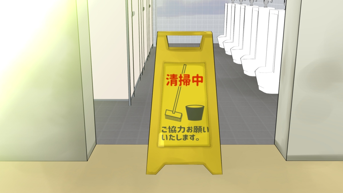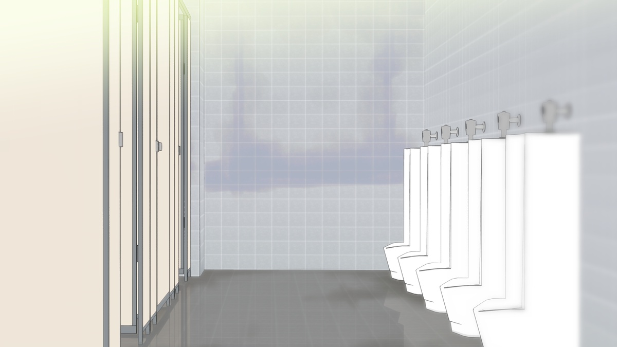 体育館での研修中、限界までおしっこを我慢していたがトイレに行くことを指導員に告げ、冷静なふりをして出口に向かう。