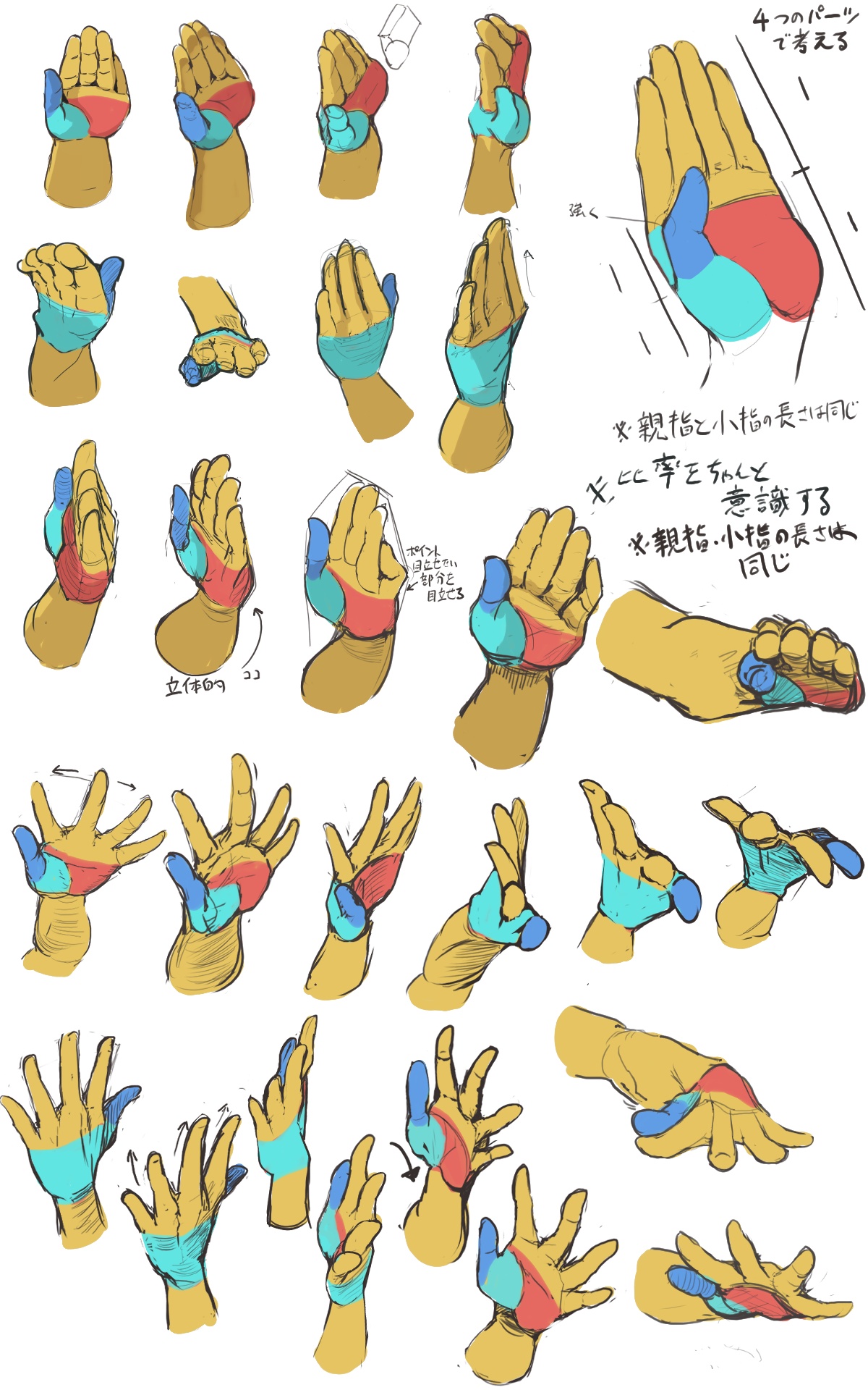 手は4つの部分的なパーツを意識して描くと描きやすい
