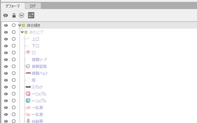 今回は「デフォーマ」という機能を使って頭・前髪・腕・全体の傾きと上下の動きをつけていきます