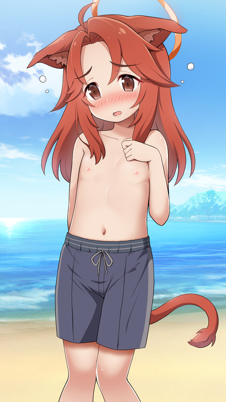 今回のskebご依頼絵はクライアントオリジナルキャラのペッタンコネコちゃん(?)です。男性水着チャレンジをしているシチュになります。