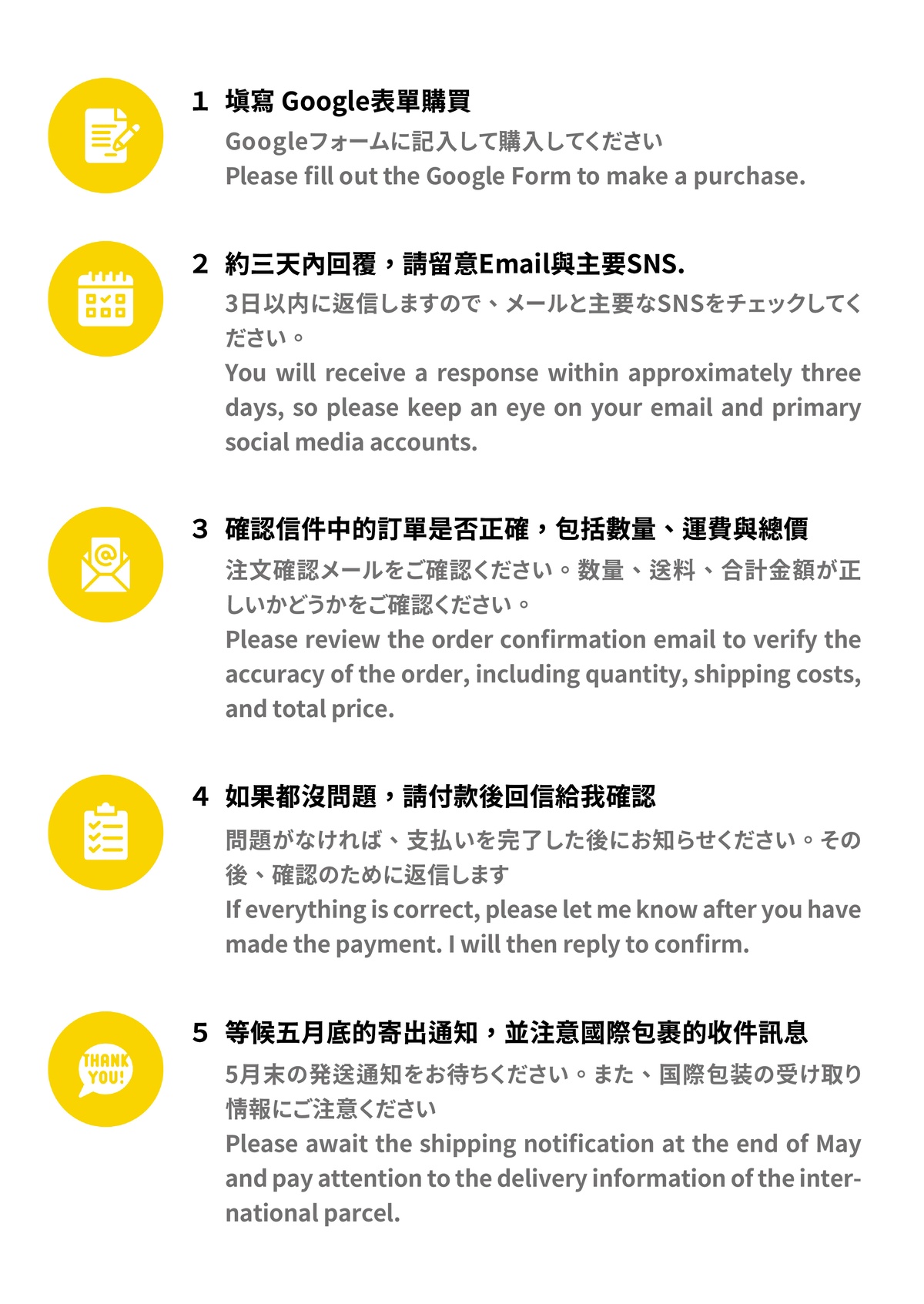 ➀ 訂購方式:填寫google表單 ⮕ Email&SNS聯繫 ⮕ 確認金額與運費⮕ 付款⮕ 確認後出貨