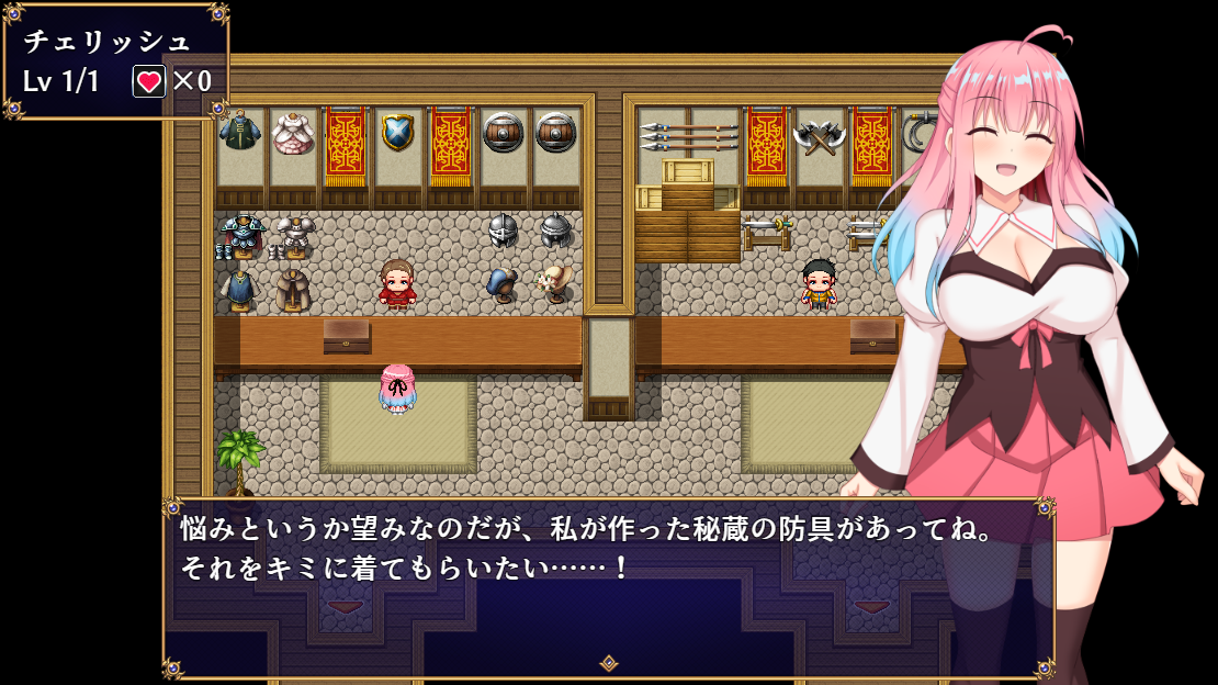防具屋にてエッチな防具を着せられるというシチュエーション