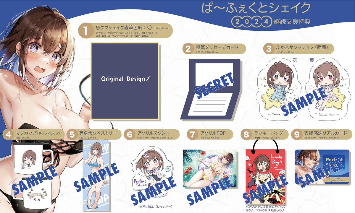 白クマシェイクのキャラクター(基本的にははわわちゃん)の他社さんとのコラボで作成したり、依頼を受けて作成したグッズの商品、サンプルなどが入ってます。これらの一部はサイン入りを想定しています。