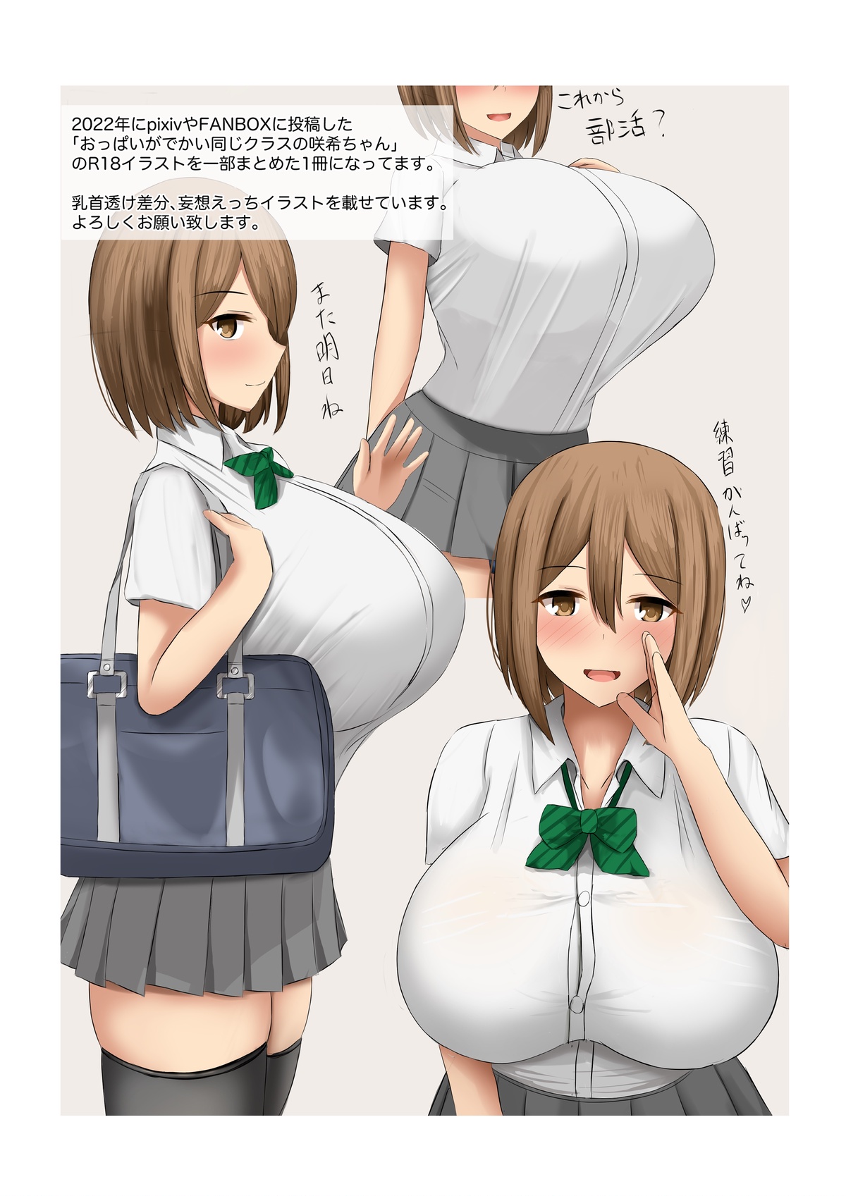 オリジナルキャラ「おっぱいがでかい同じクラスの咲希ちゃん」のpixivやfanboxに投稿した、セリフ付きのイラストをまとめた1冊になってます。(本限定描き下ろし有)