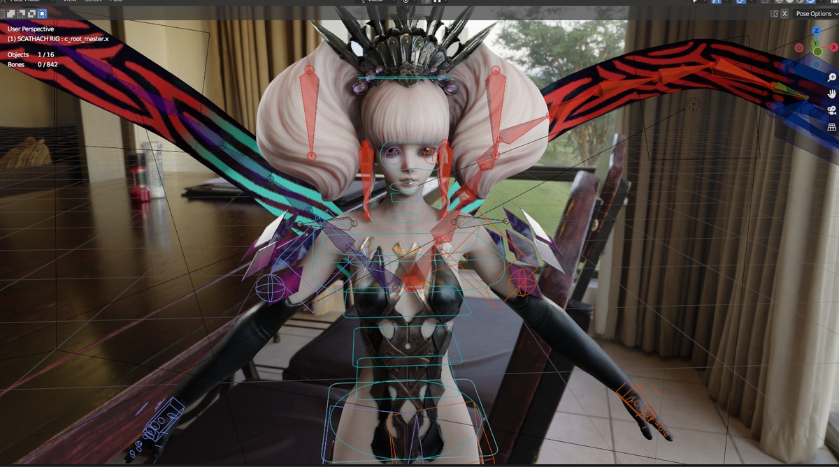 Like any FF14 boss models before Stormblood, she is super low poly and her texture is super blurry. Tried using A.I to upscale and enhance the texture quality a little bit, but the end result is still too blurry. So I end up just try to hide them with metalic shader. At some point in the future, I might just animate her without the body suit.