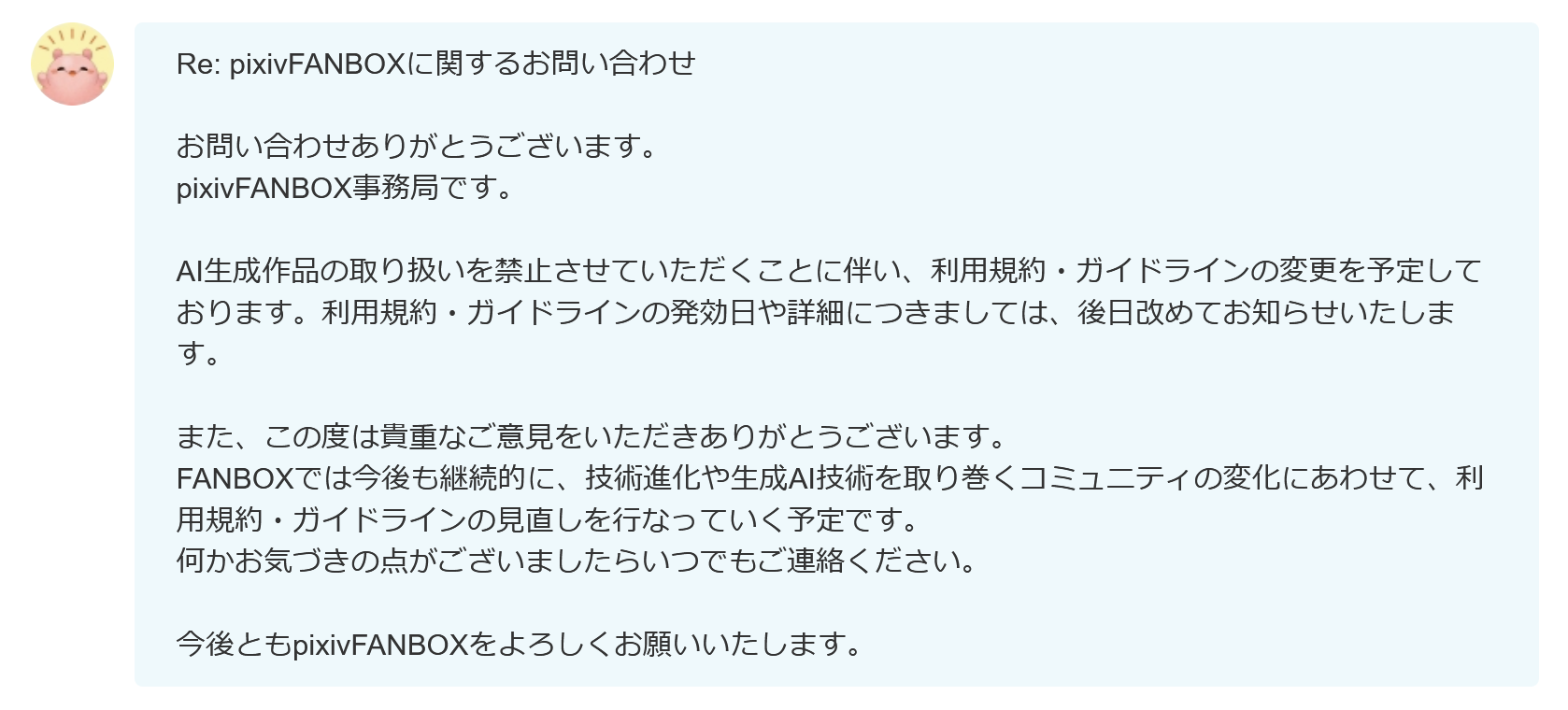 This article is intended to address the concerns regarding FANBOX's regulations on AI-generated works. I had assumed that FANBOX's terms would be updated today, May 31, and that posting would be banned from June, but as of now, I have received no such announcement from FANBOX. I am quite perplexed. I have contacted FANBOX's management, but they have only instructed me to wait for further updates. I understand this is a very complex issue and I don't blame FANBOX's management. However, as I am receiving your support, I cannot simply do nothing. Therefore, I'd like to share the following: