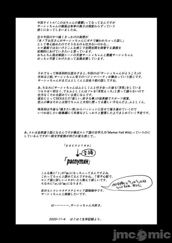 ※えっち漫画じゃないので直接的なsexシーンなどは無いです。 時系列的には「サーシャちゃんがようこそ」の半年くらい前の、 何故サーシャちゃんは木ノ下お兄さんを嫌う事になったのかっていう感じの小話でもあります。