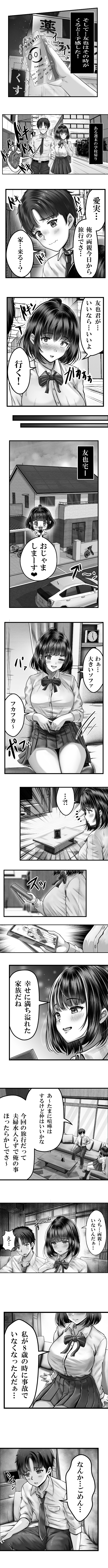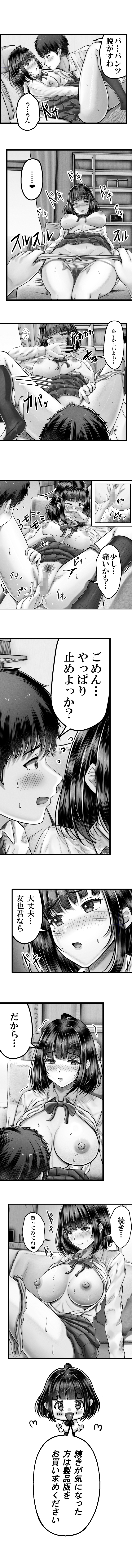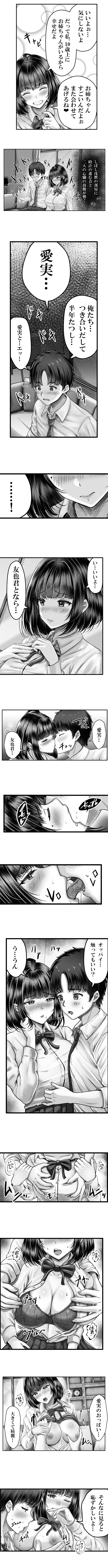 愛実は友也の事を前から気になっていたので告白を快諾し付き合う事になる。ある週末の学校帰り、友也は「今日から旅行で親がいないから家くる?」と愛実に伝え友也の家で2人は初めてを経験する。友也の家から帰りたくない愛実は姉の未咲(みさき)にRINEでお泊りを伝えるが、お泊りする条件は次の日、実咲の家に連れていき友也を会わせる事だった。