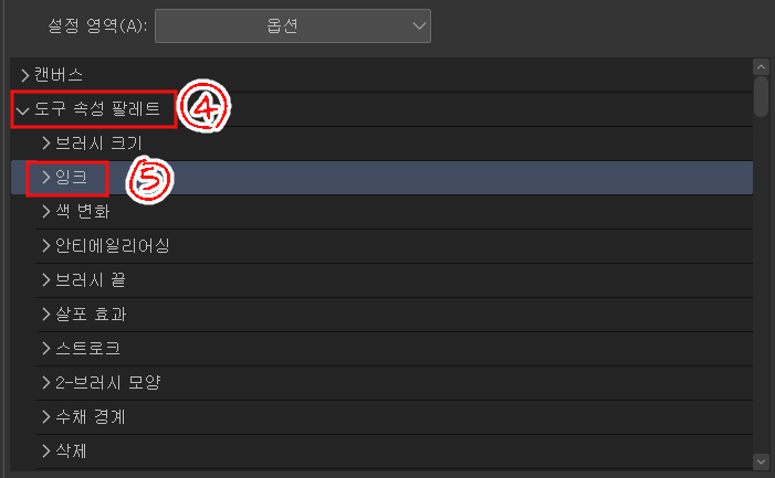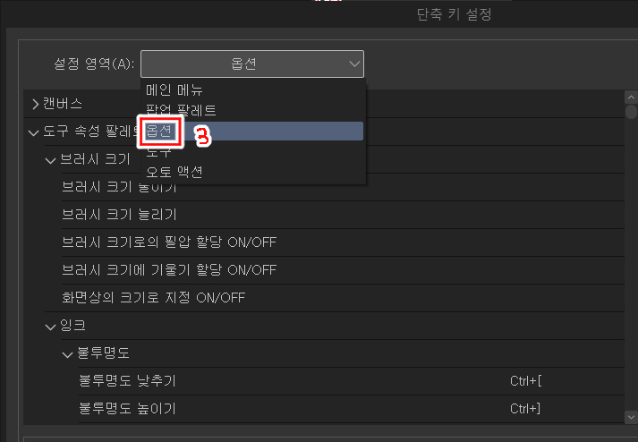 ファイル >> ショートカット設定 >> 設定領域「オプション」 >> ツールプロパティパレット >> インク >> 不透明度